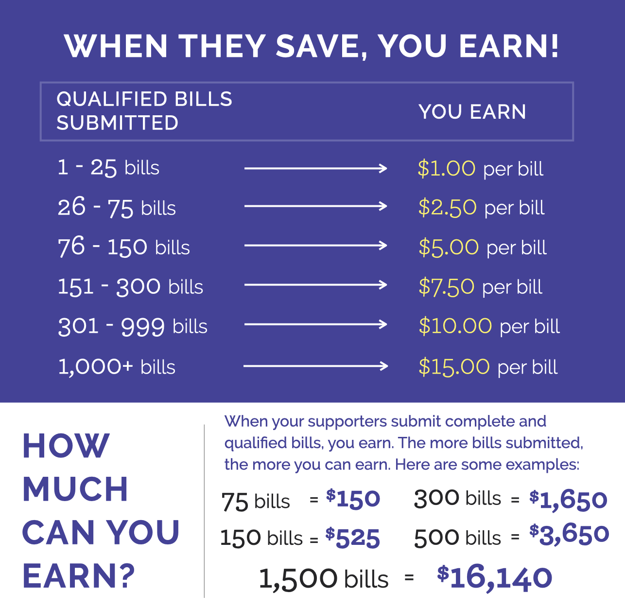 • Earn revenue when your supporters upload their bills